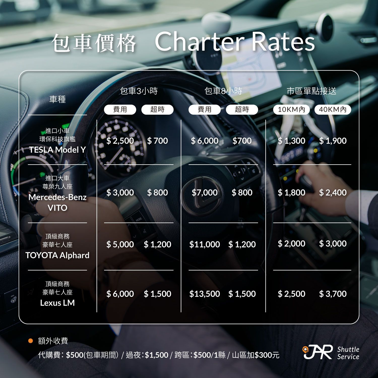 專屬包車,為您量身規劃每一趟城市行程。旅遊、拍攝、巡店、接待貴賓,全程配合。